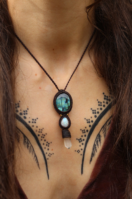 Micro macrame pendant | Labradorite, Moonstone & Quartz