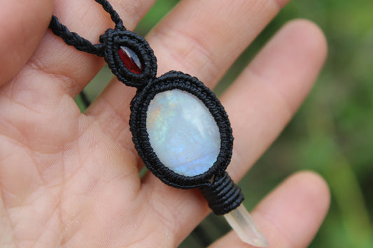 Micro macrame pendant | Garnet, Moonstone & Quartz