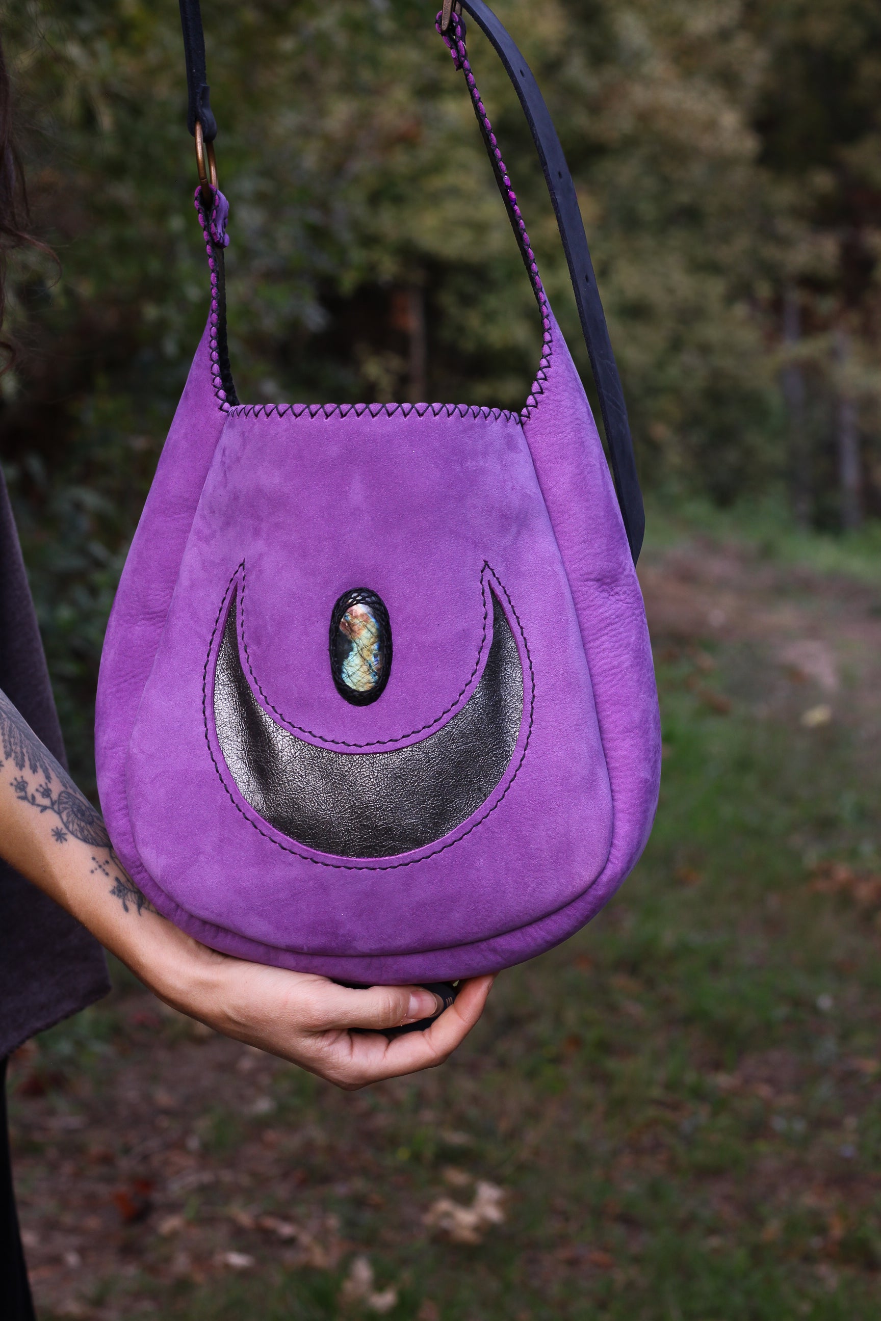 Handmade shoulder/ crossbody bag made out of reclaimed Purple suede with black/silver moon and labradorite crystal