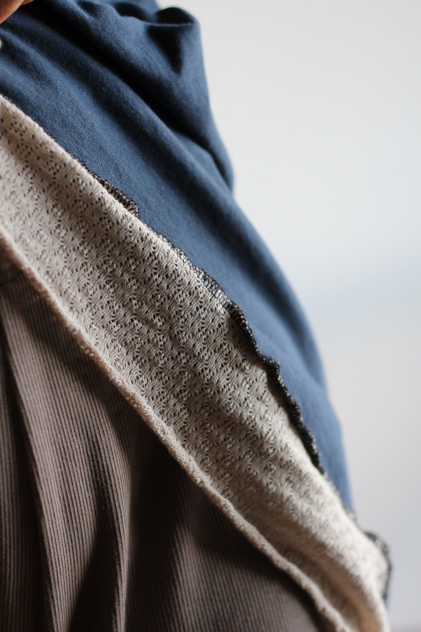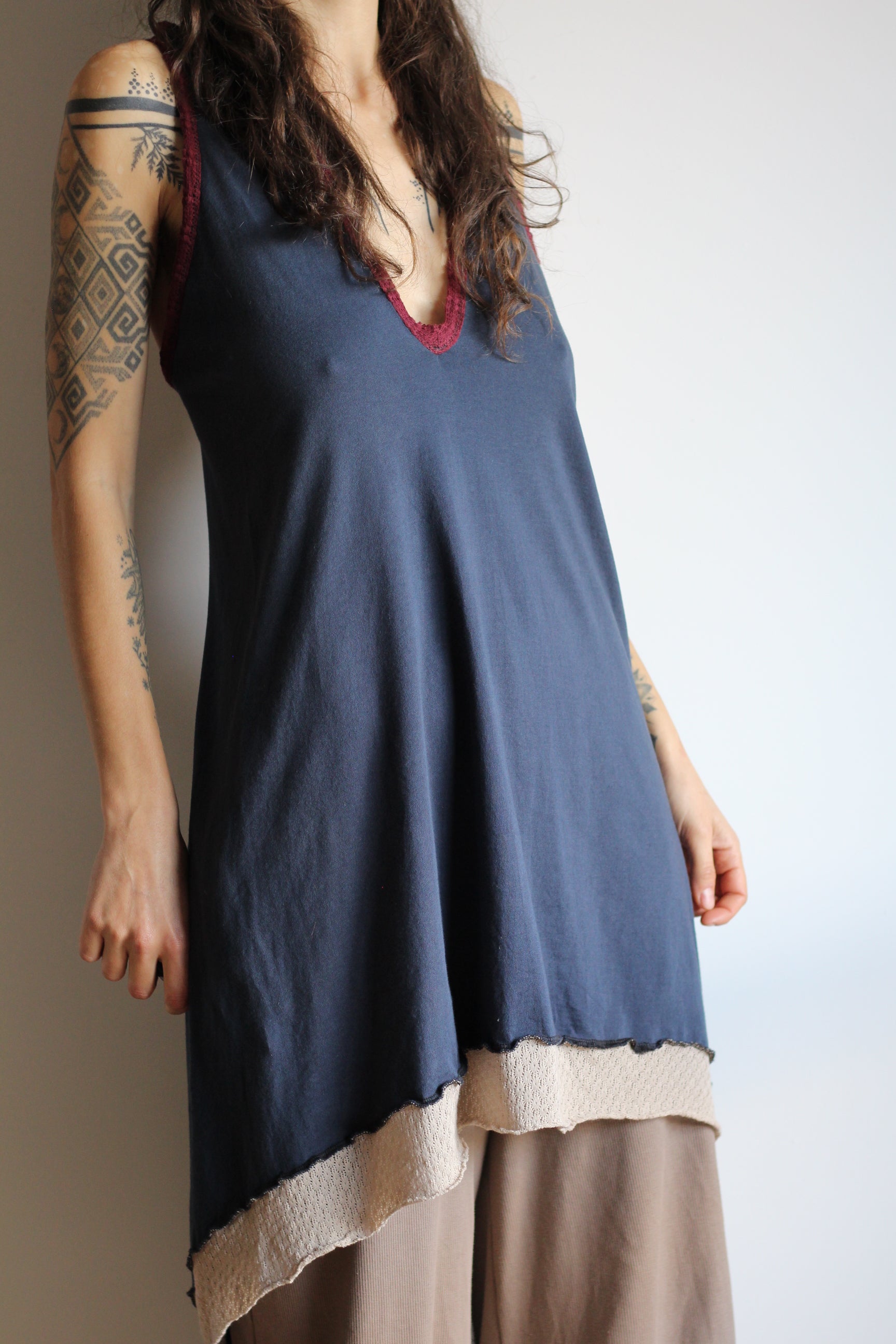 One of a kind dress in 100% blue cotton jersey with beige lace details and bordeaux texture details