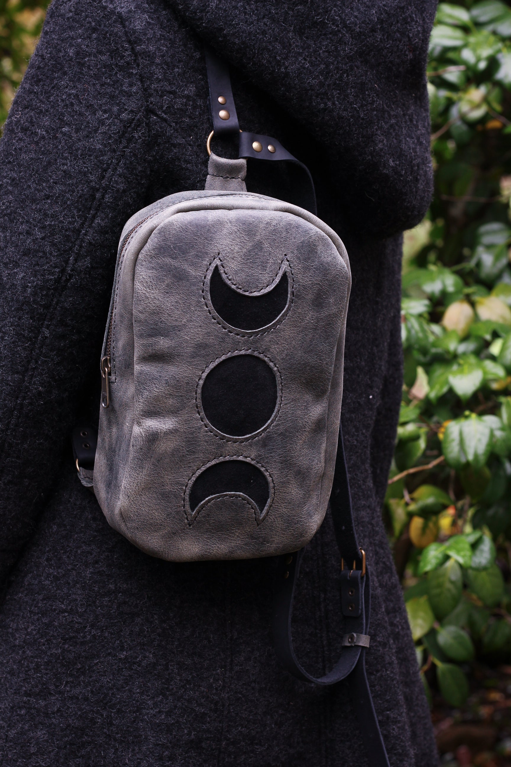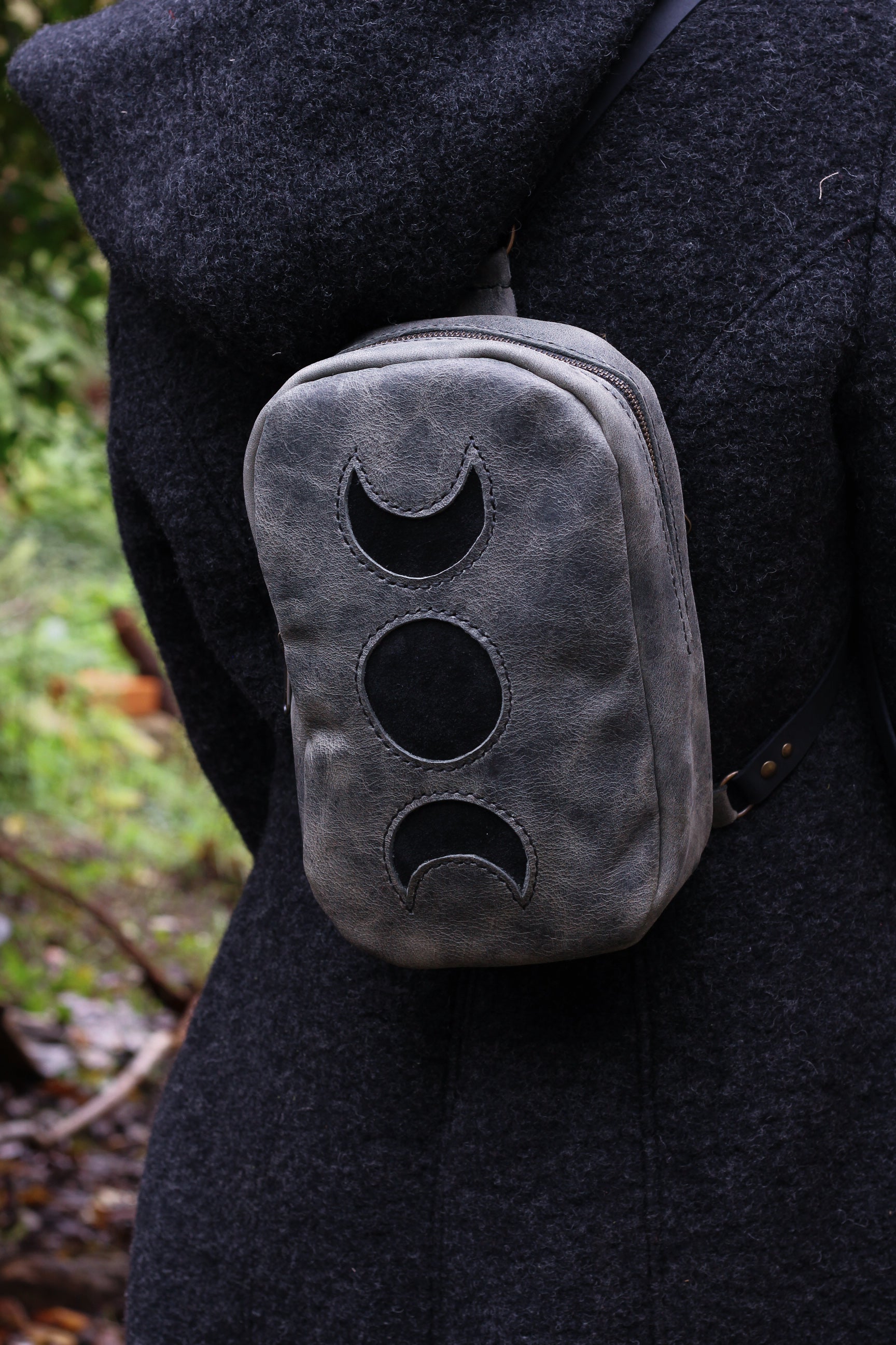 Moon backpack in Dark agreen leather and Black suede, with old gold metals
