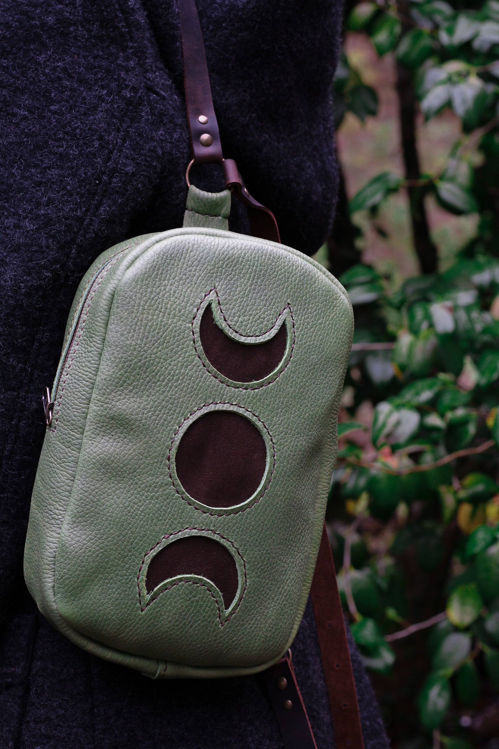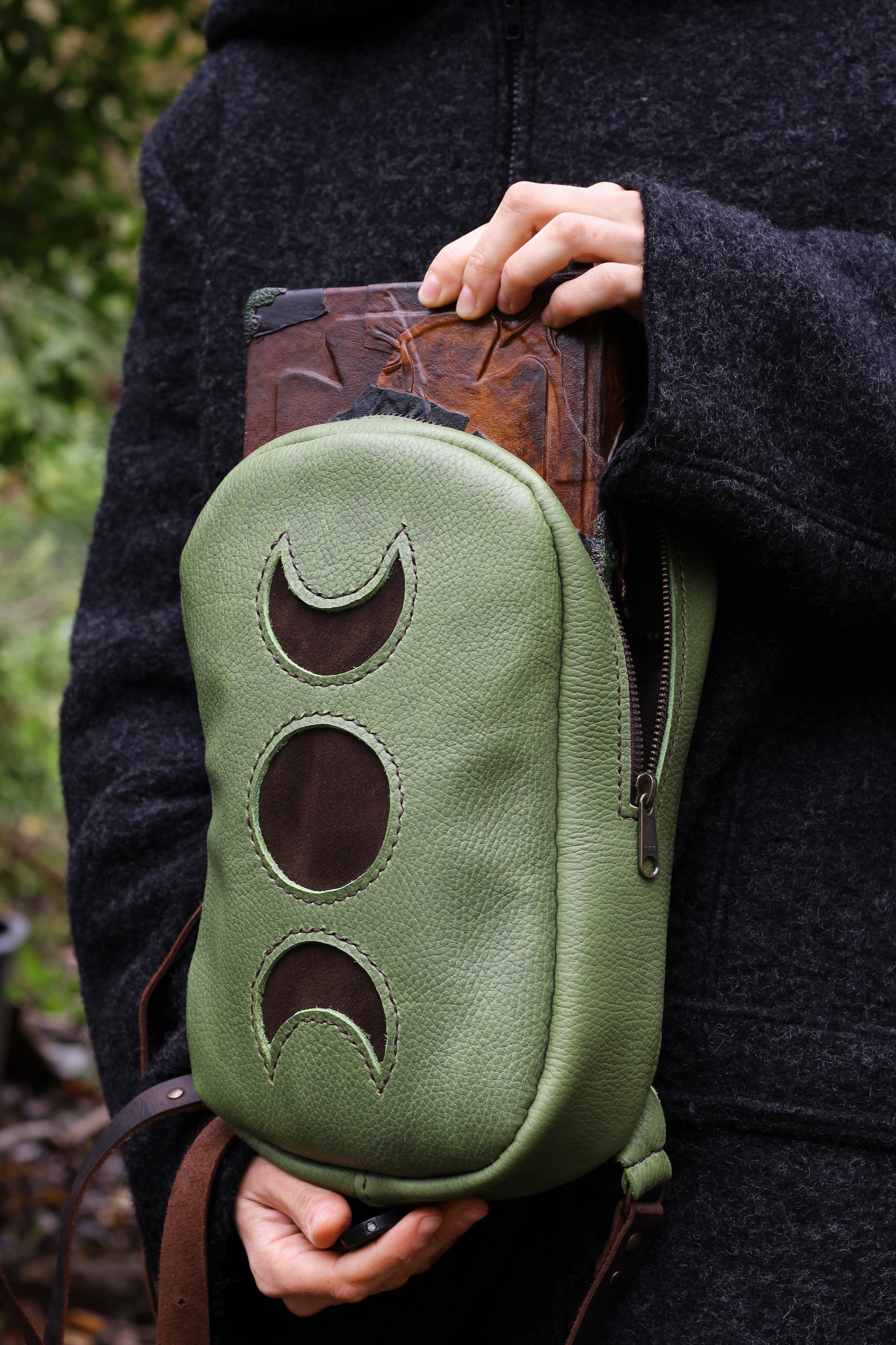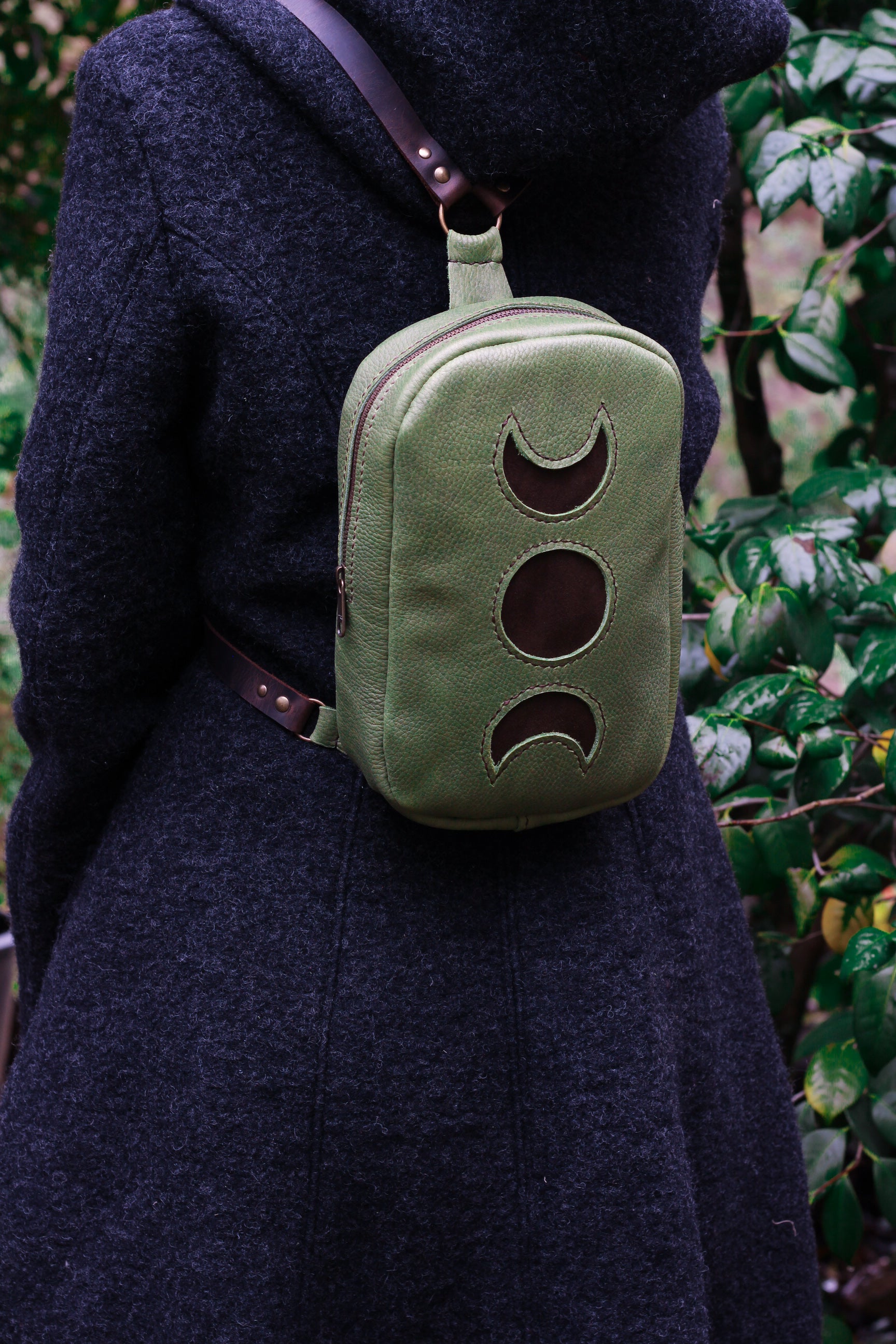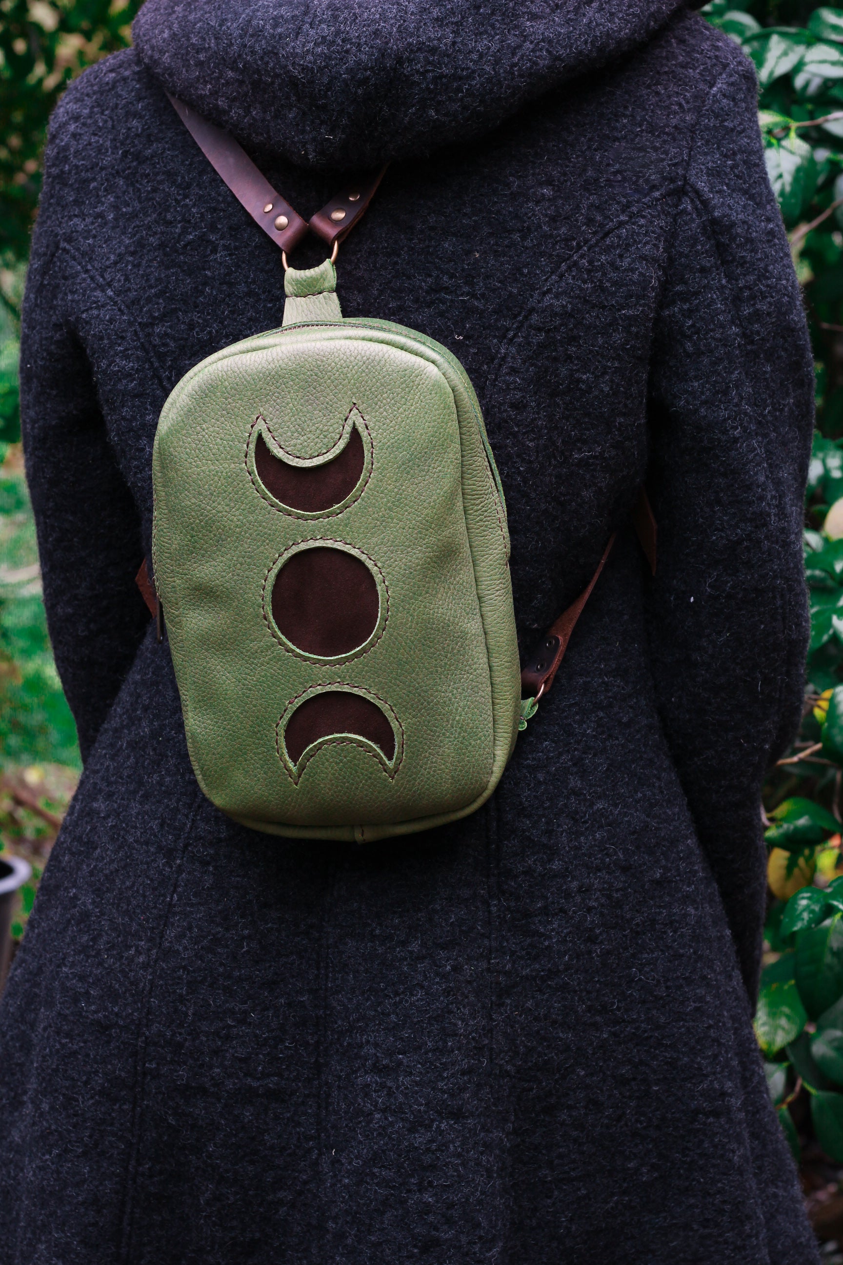 Moon backpack in Green leather and dark brown suede, with old gold metals