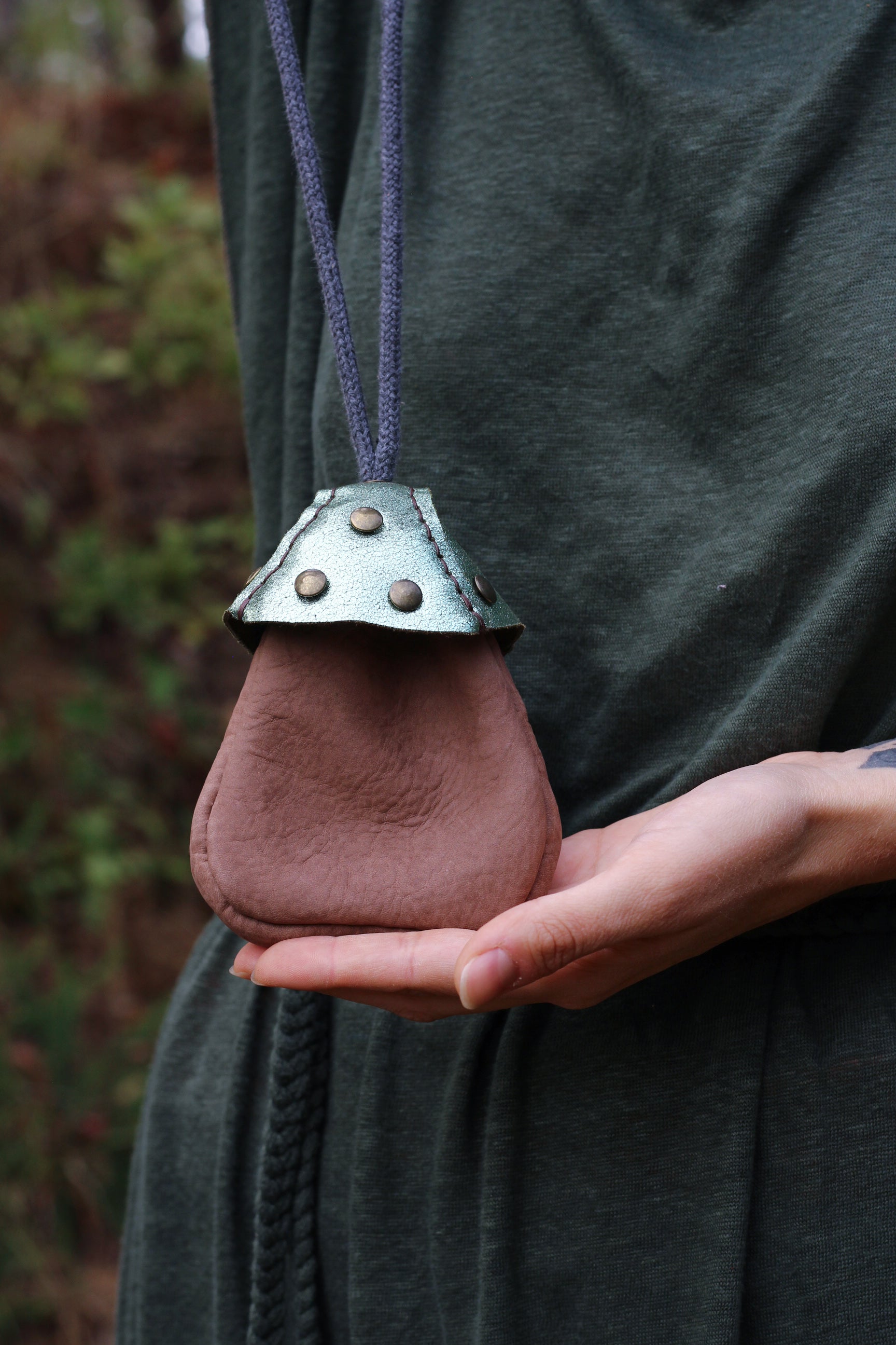 with a cotton cord it can be worn as a necklace, tied on a belt or hanged as a decorative pouch