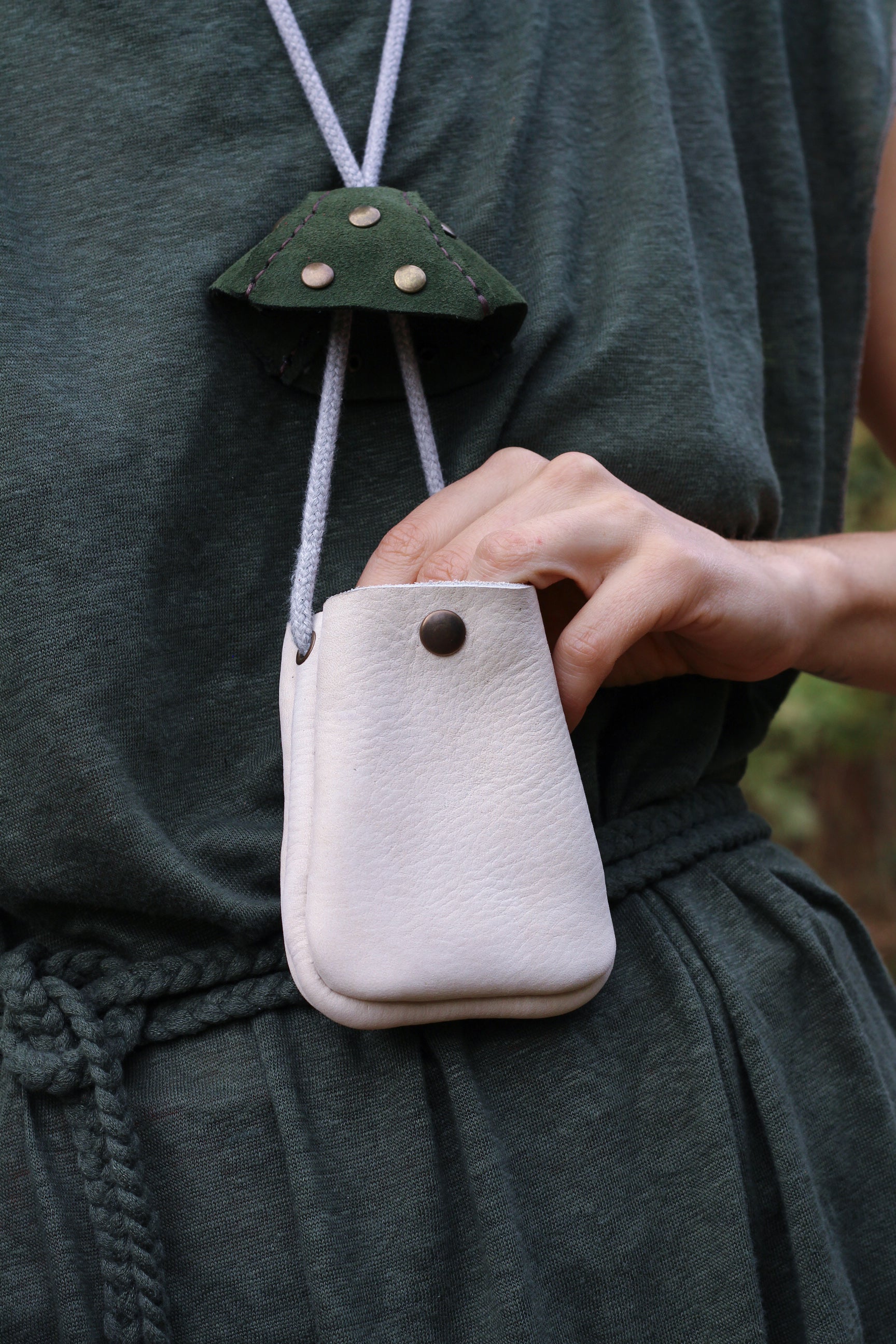 with a cotton cord it can be worn as a necklace, tied on a belt or hanged as a decorative pouch