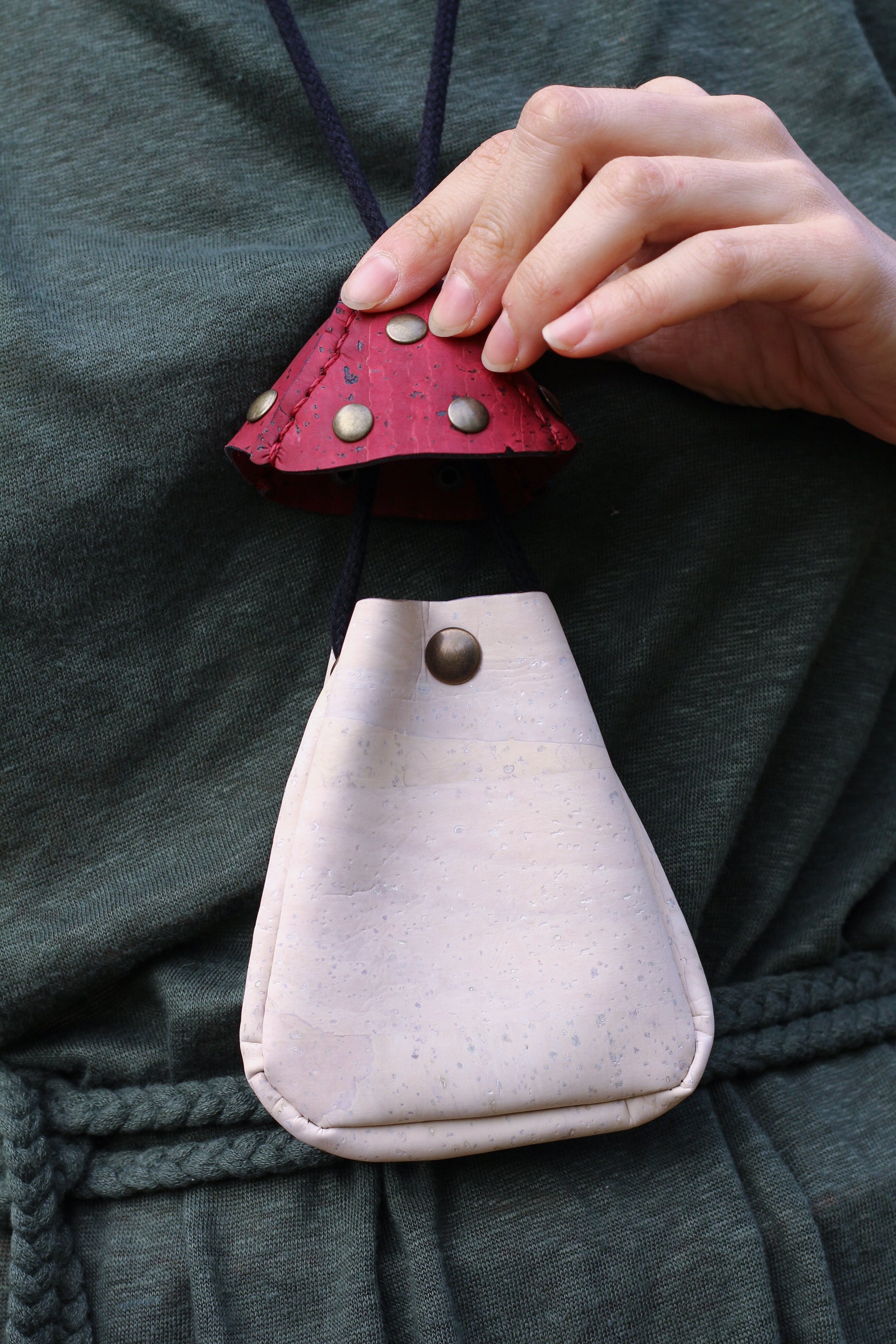 made of cork with a cotton cord it can be worn as a necklace, tied on a belt or hanged as a decorative pouch